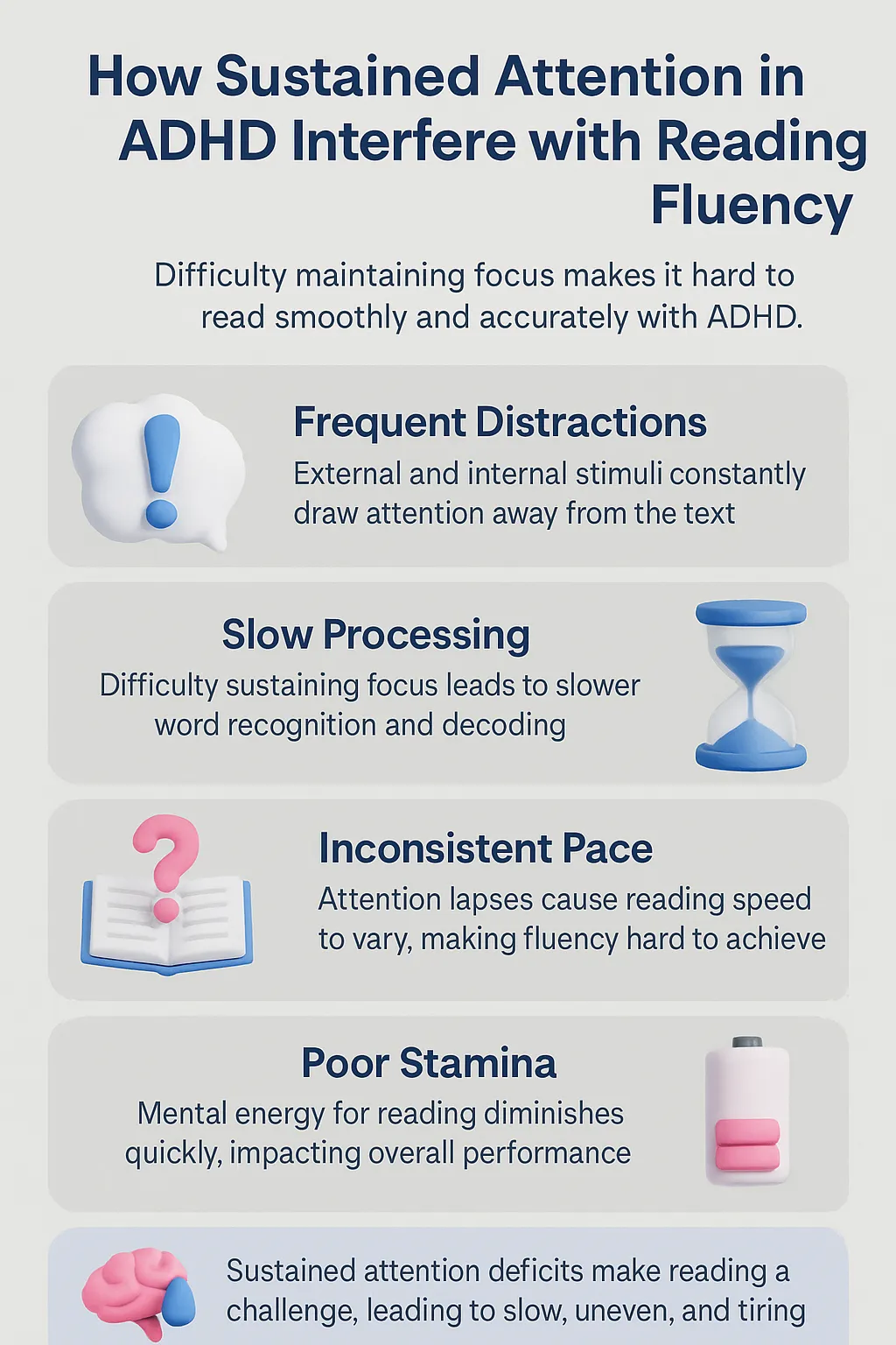 - ADHD affects reading focus, not intelligence. Attention lapses interrupt comprehension and fluency.